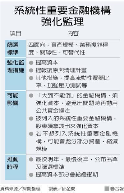 金管會研議推動境內系統性重要金融機構監理措施,對「大到不能倒」的金融機構,將採取提高資本、提出清理計畫等強化手段,最快明年上路,初估列入名單的在十家以內。
