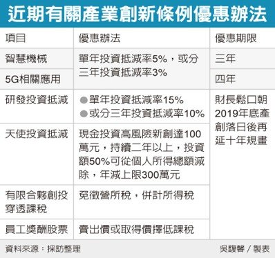 至於產創條例的租稅優惠明年底落日後,四大租稅優惠包括研發投資抵減、天使投資人半數投資額抵減、有限合夥創投享「穿透課稅」、員工獎酬股票擇低課稅等;財政部長蘇建榮日前已在立法院透露,經濟部與財政部已有共識將朝延長十年的方向來規畫。