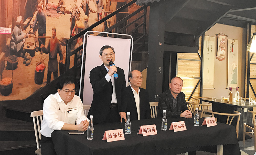 東莞市台灣事務局副調研員胡國勇(立者)致辭、東莞台協協七區區長洪柏榕(右二)、東莞台協虎門分會會長蕭銘任(左一)、東莞台協沙田分會會長鄭錫銅(右一)列席。吳瑞浩/攝影